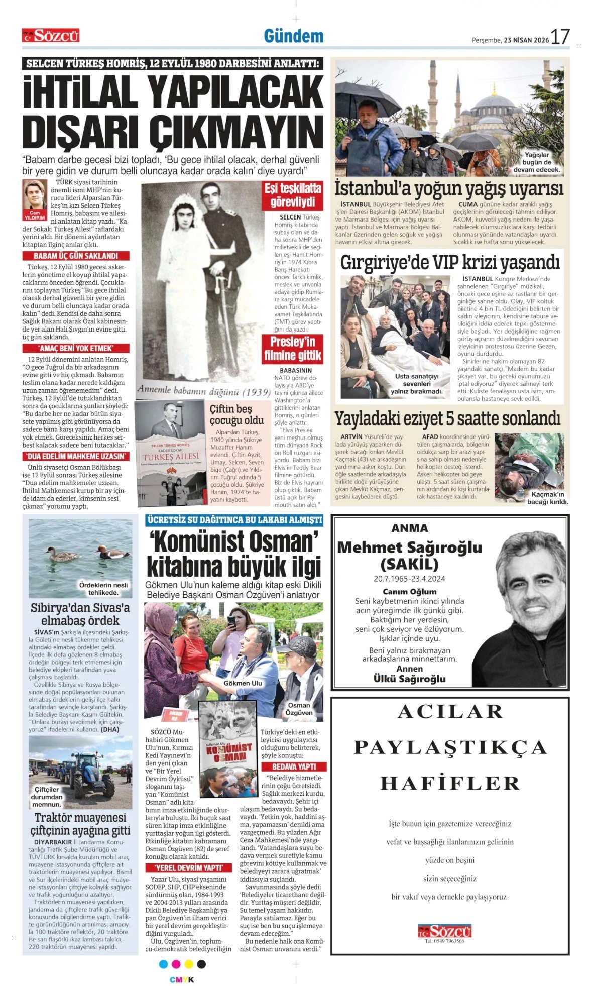 23 Nisan 2026 tarihli Sözcü Gazetesi vefat, başsağlığı ve anma ilanları. İstanbul, Ankara, İzmir ve Adana baskılarında yer alan ilanlar yayınlanmaktadır.
