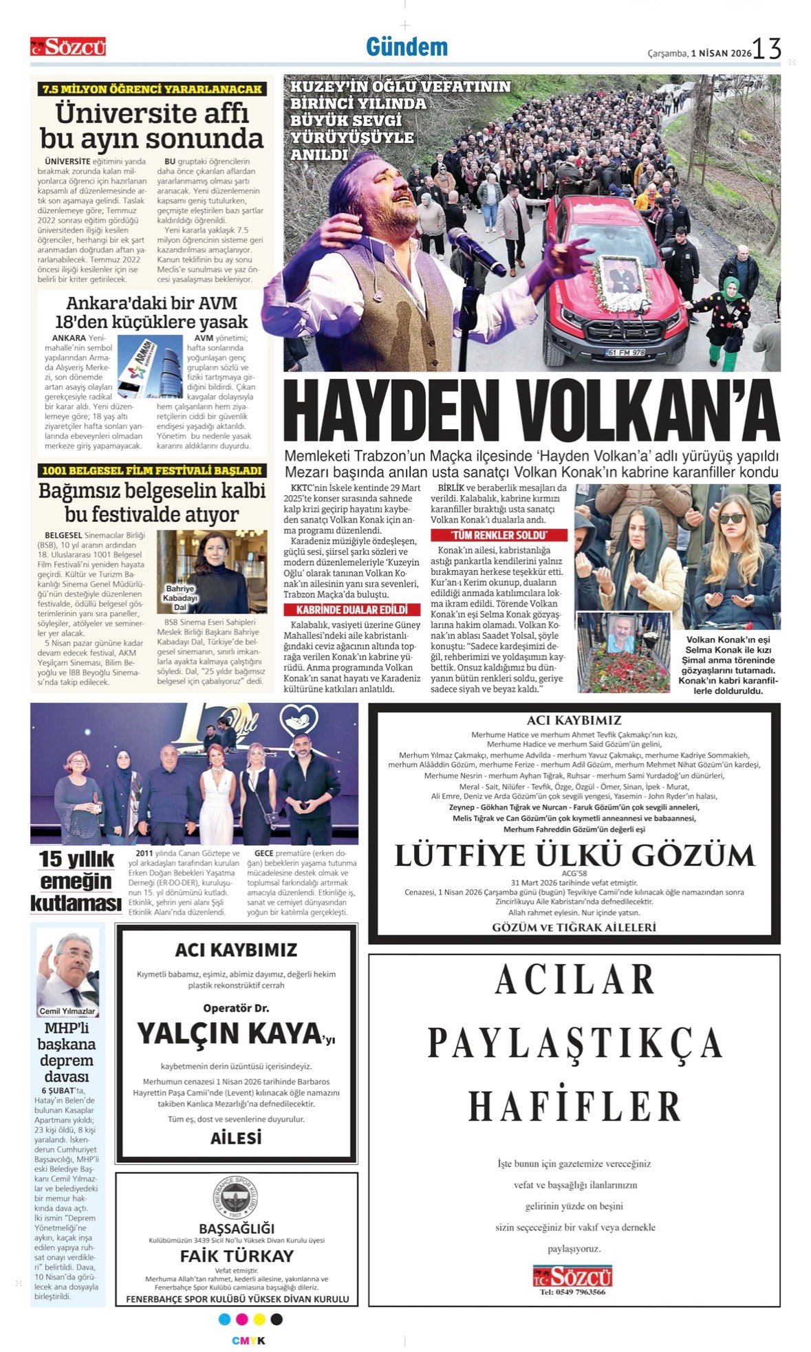 1 Nisan 2026 Sözcü Gazetesi vefat, başsağlığı ve anma ilanları.