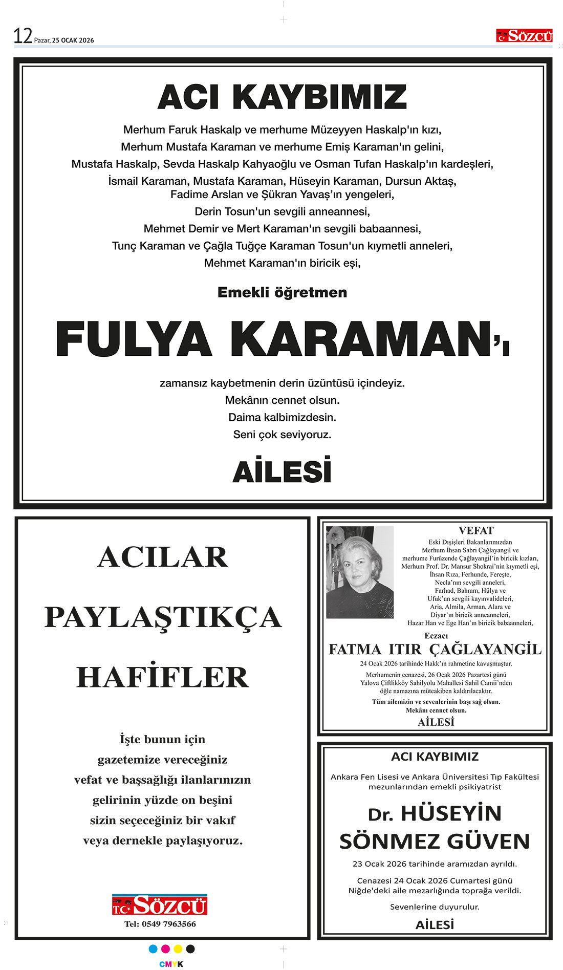 Sözcü Bugünkü Vefat (Ölüm) – Başsağlığı – Anma – Teşekkür – Mevlit İlanları-25.1.2026