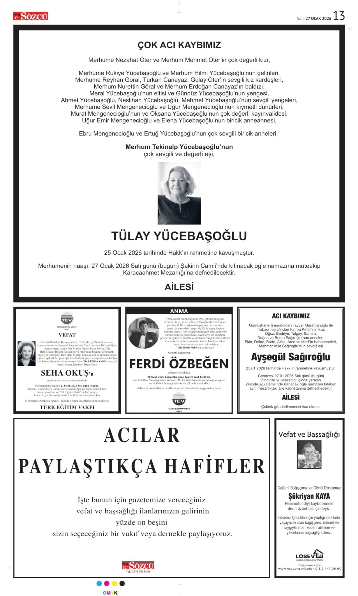 Sözcü Bugünkü Vefat (Ölüm) – Başsağlığı – Anma – Teşekkür – Mevlit İlanları-27.1.2026