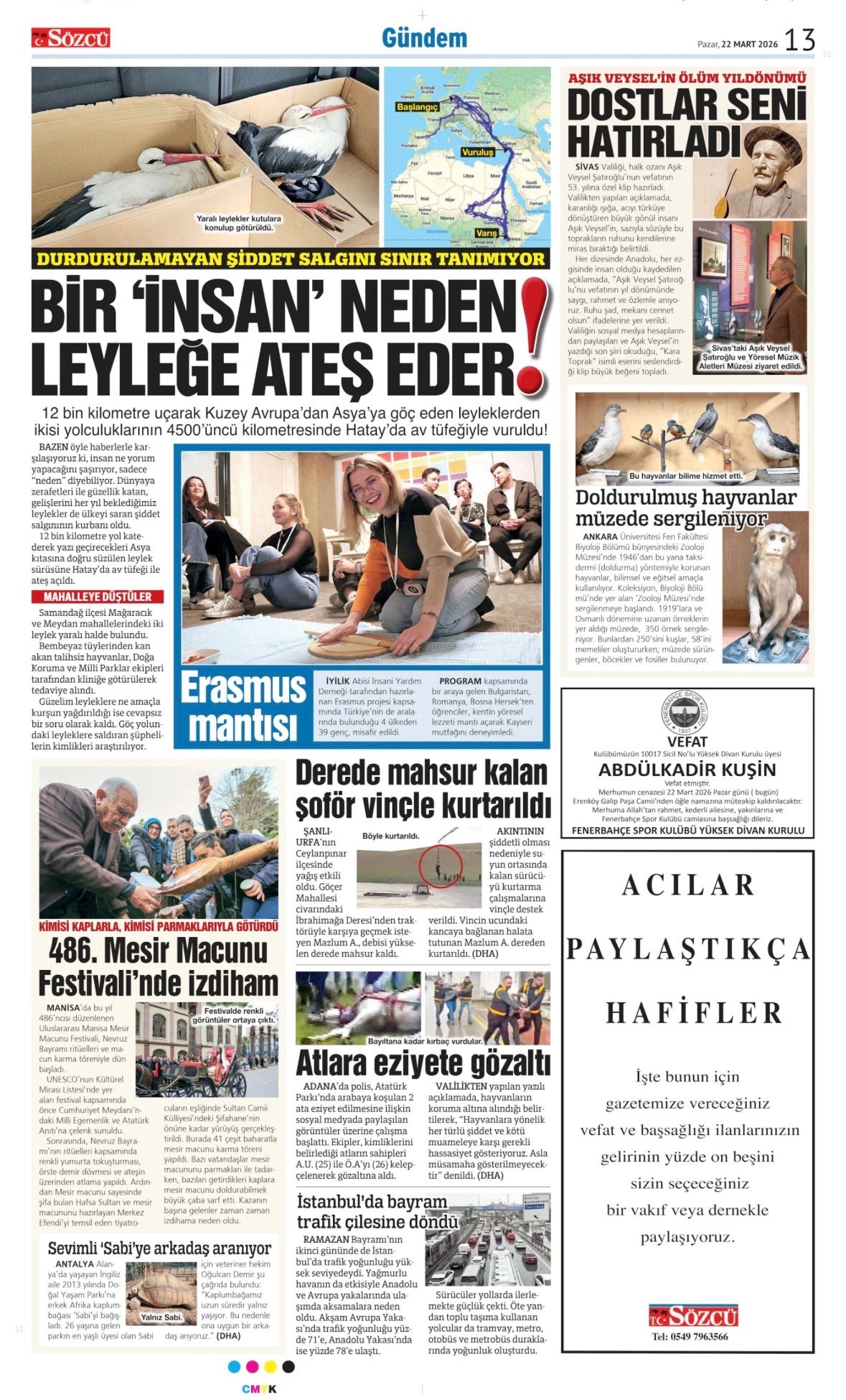 22 Mart 2026 Sözcü Gazetesi vefat, başsağlığı ve anma ilanları. İlan