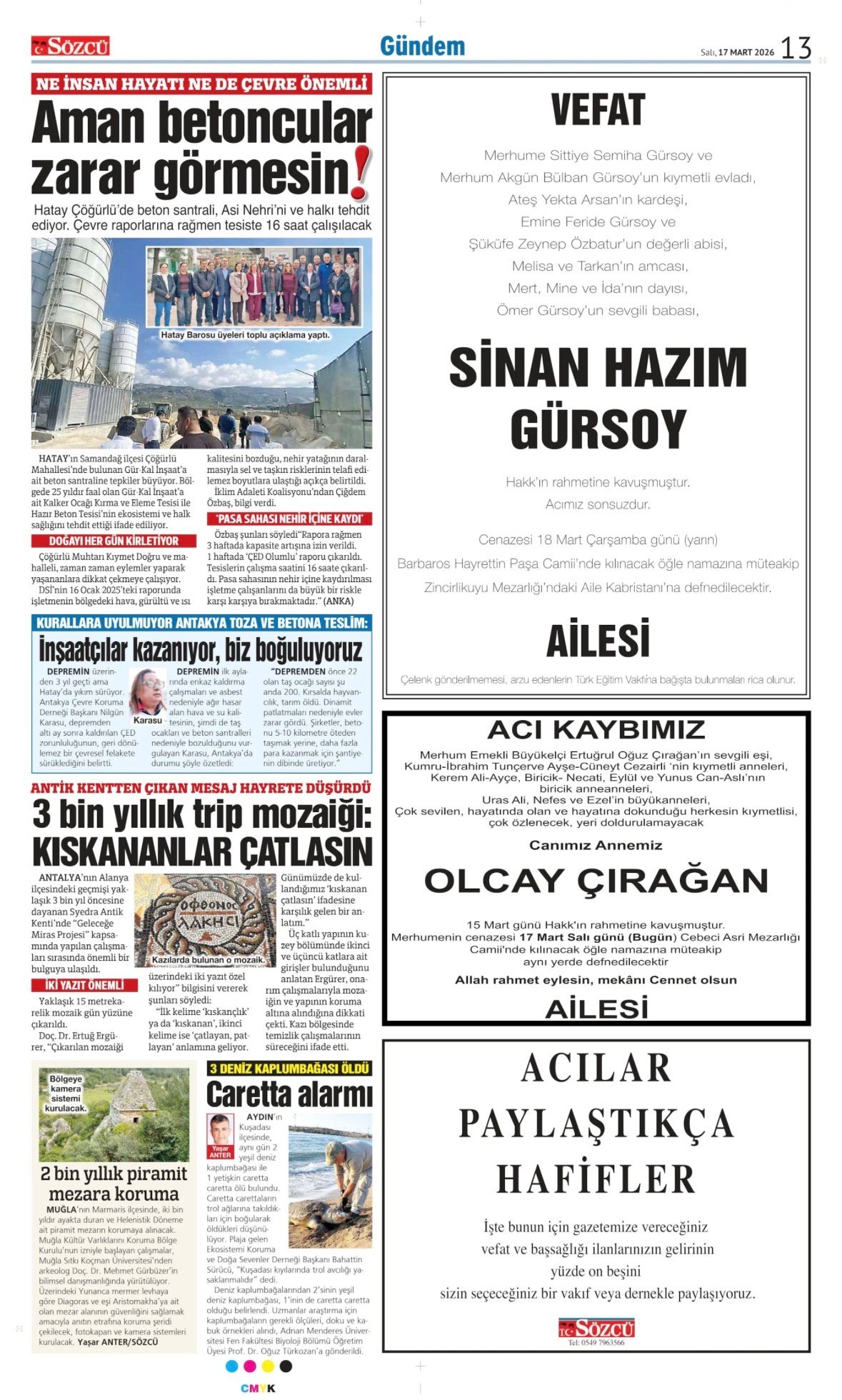 17 Mart 2026 Sözcü Gazetesi vefat, başsağlığı ve anma ilanları. İlan vermek için 0533 504