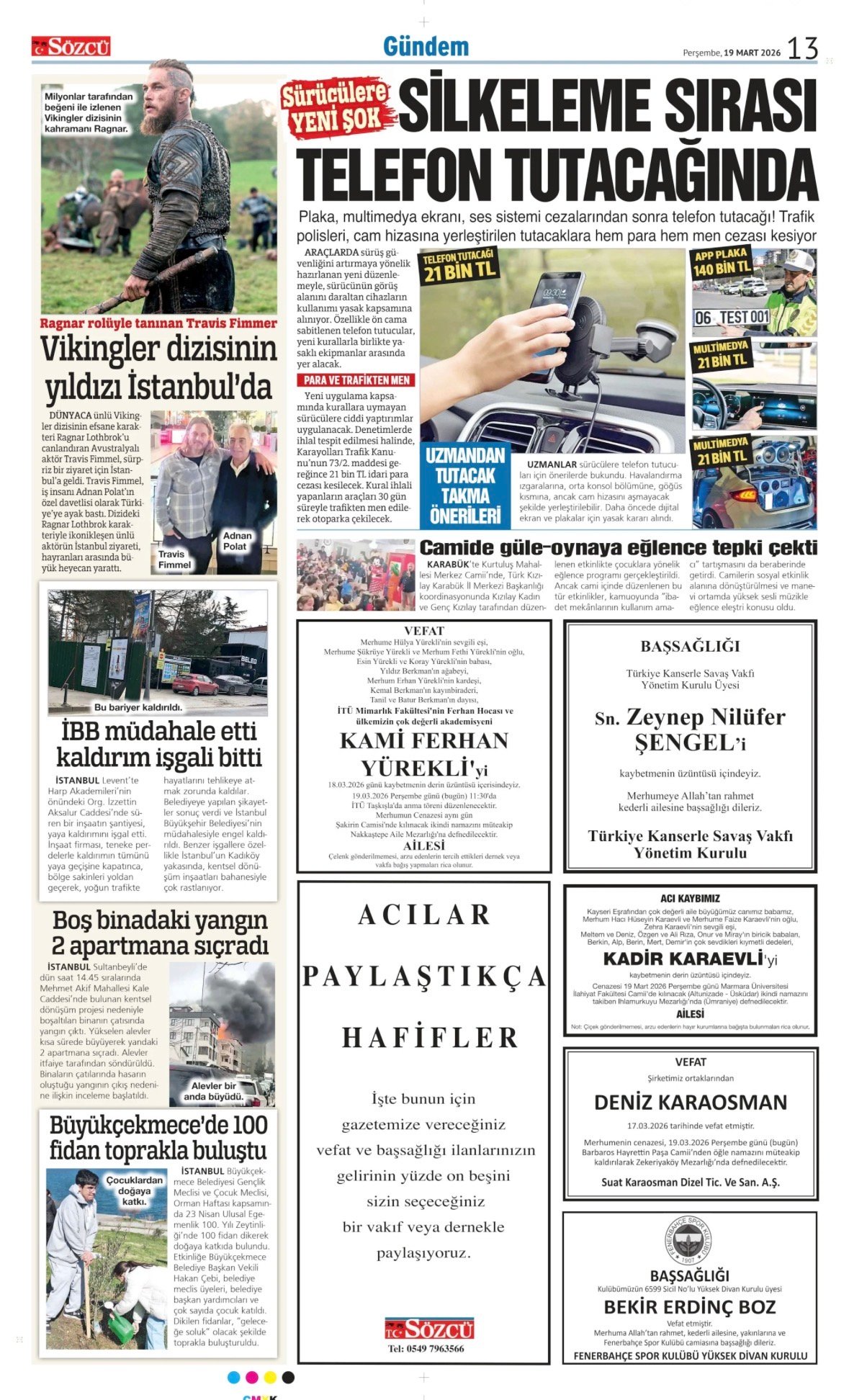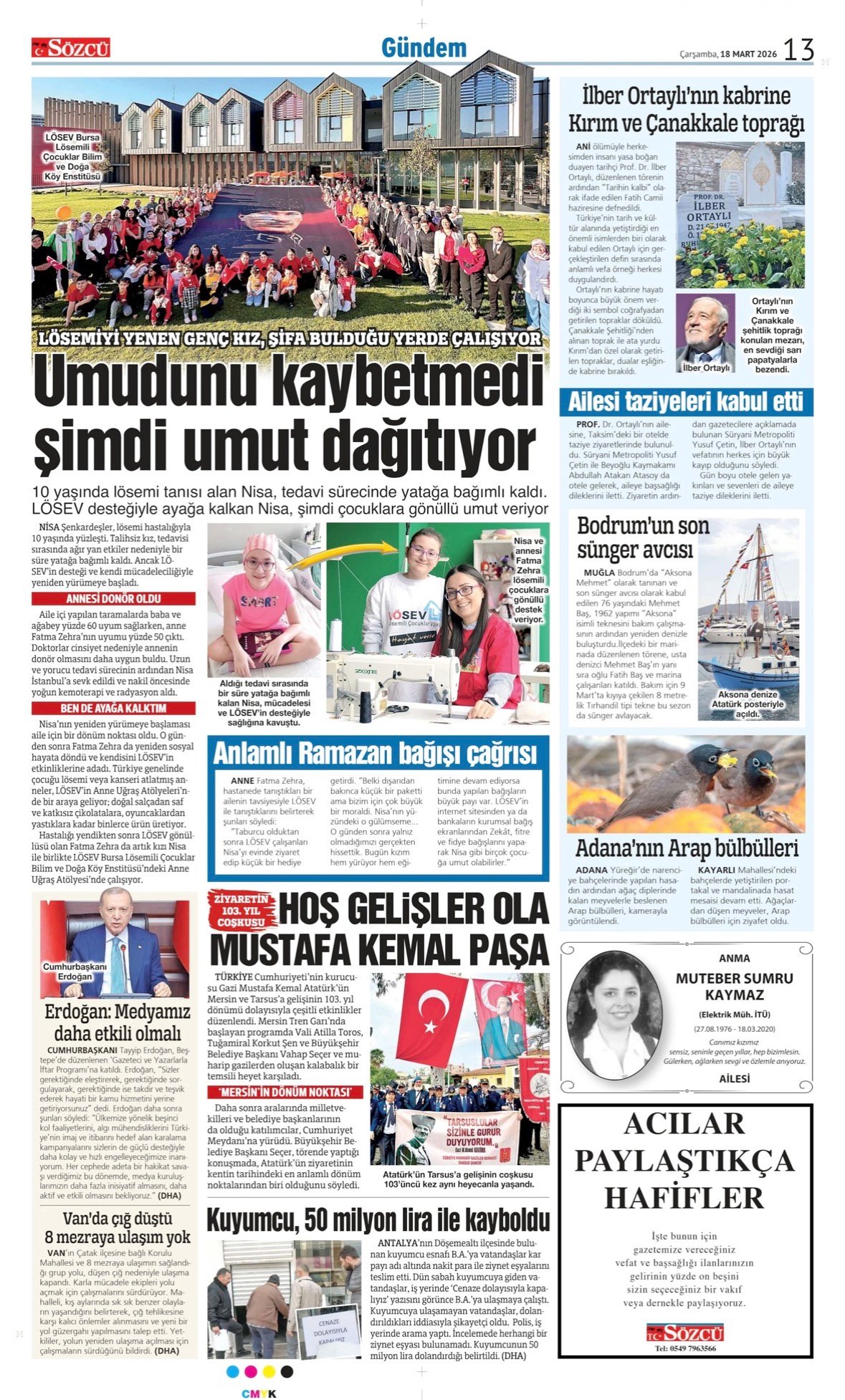 Sözcü Bugünkü Vefat İlan- Başsağlığı İlanı- Anma İlanları ve Arşiv Sayfalar. 13.3.2026