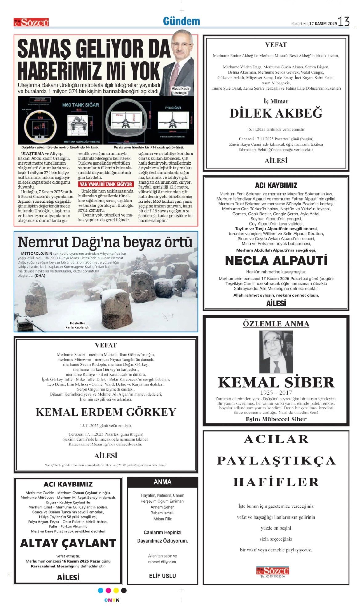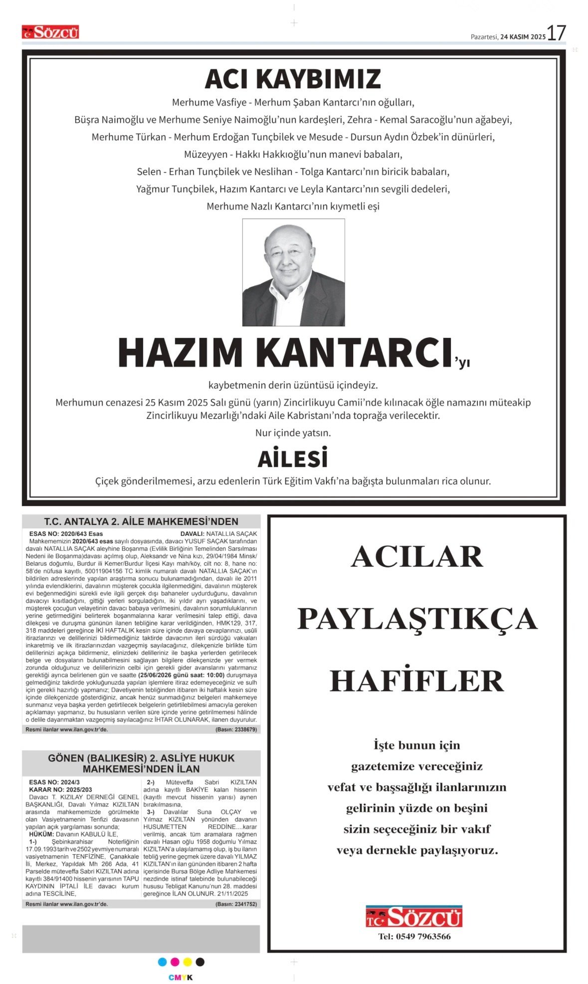 Sözcü Bugünkü Vefat İlan- Başsağlığı İlanı- Anma İlanları ve Arşiv Sayfalar. 18.11.2025