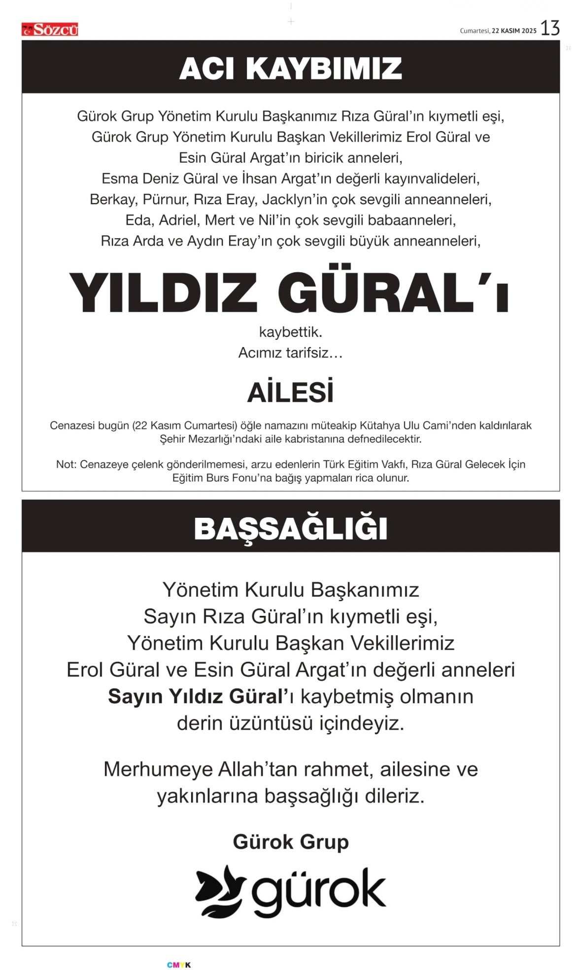 Sözcü Bugünkü Vefat İlan- Başsağlığı İlanı- Anma İlanları ve Arşiv Sayfalar. 21.11.2025