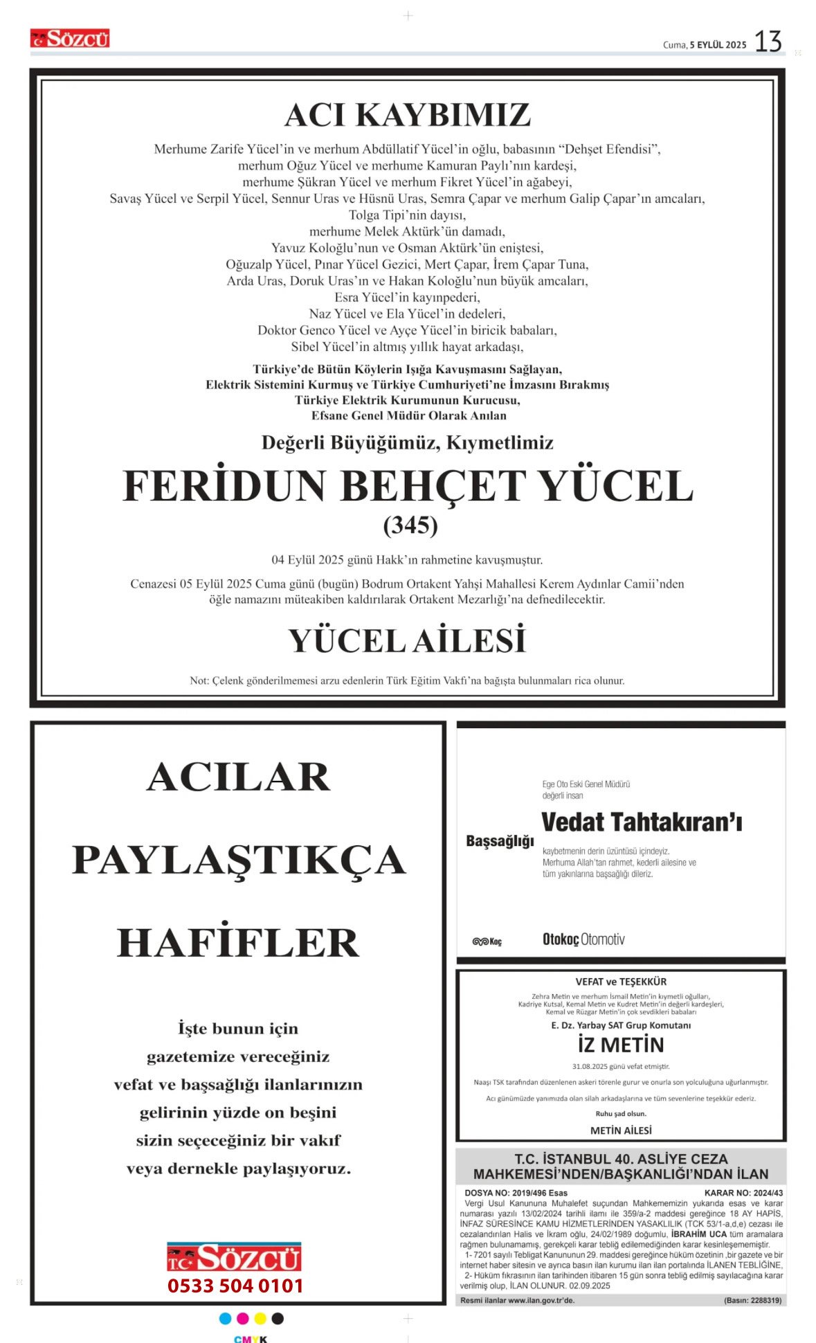 Sözcü Bugünkü Vefat İlanlar 13.9.2025;
