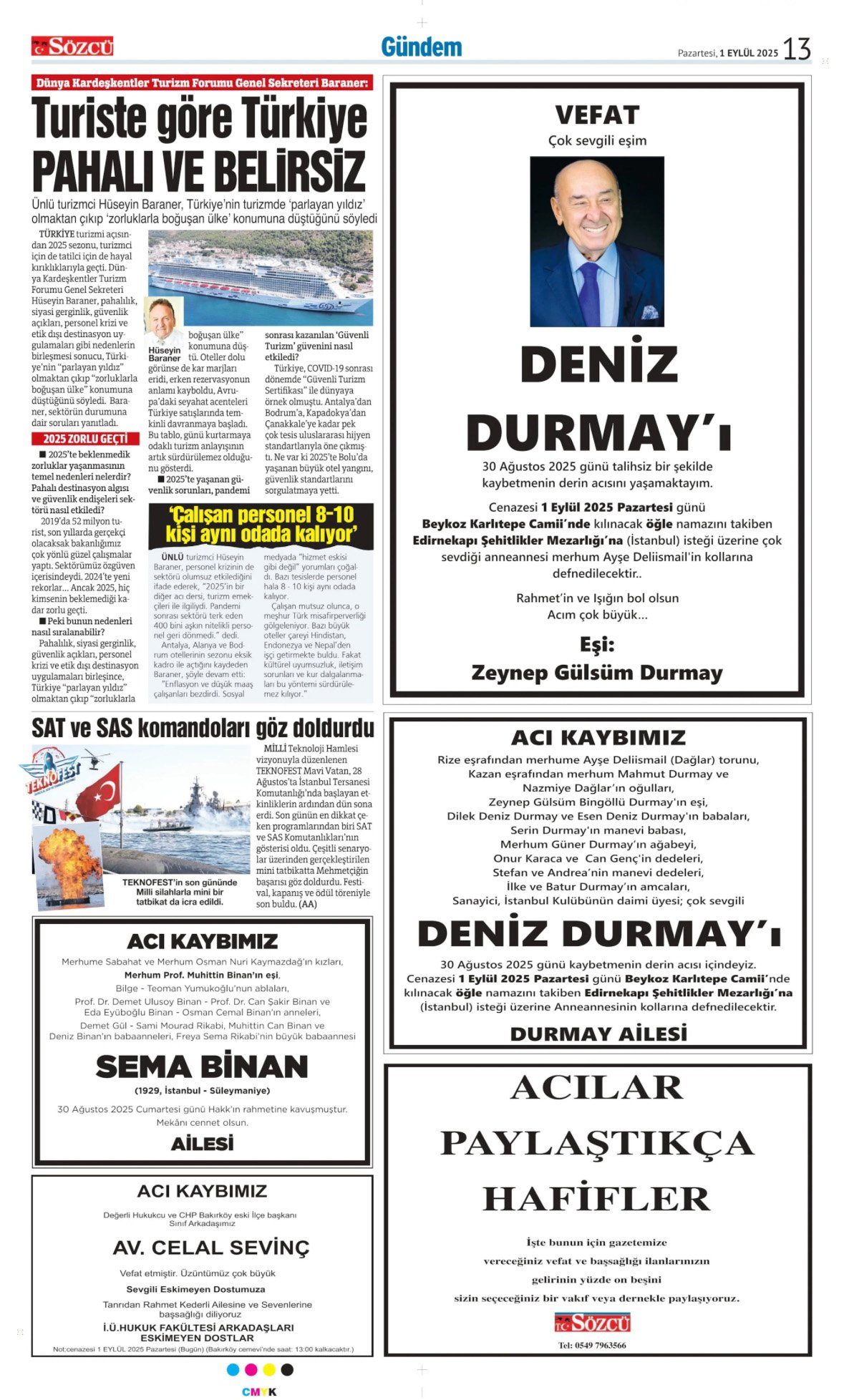 Sözcü Bugünkü Vefat İlanlar 1.9.2025;