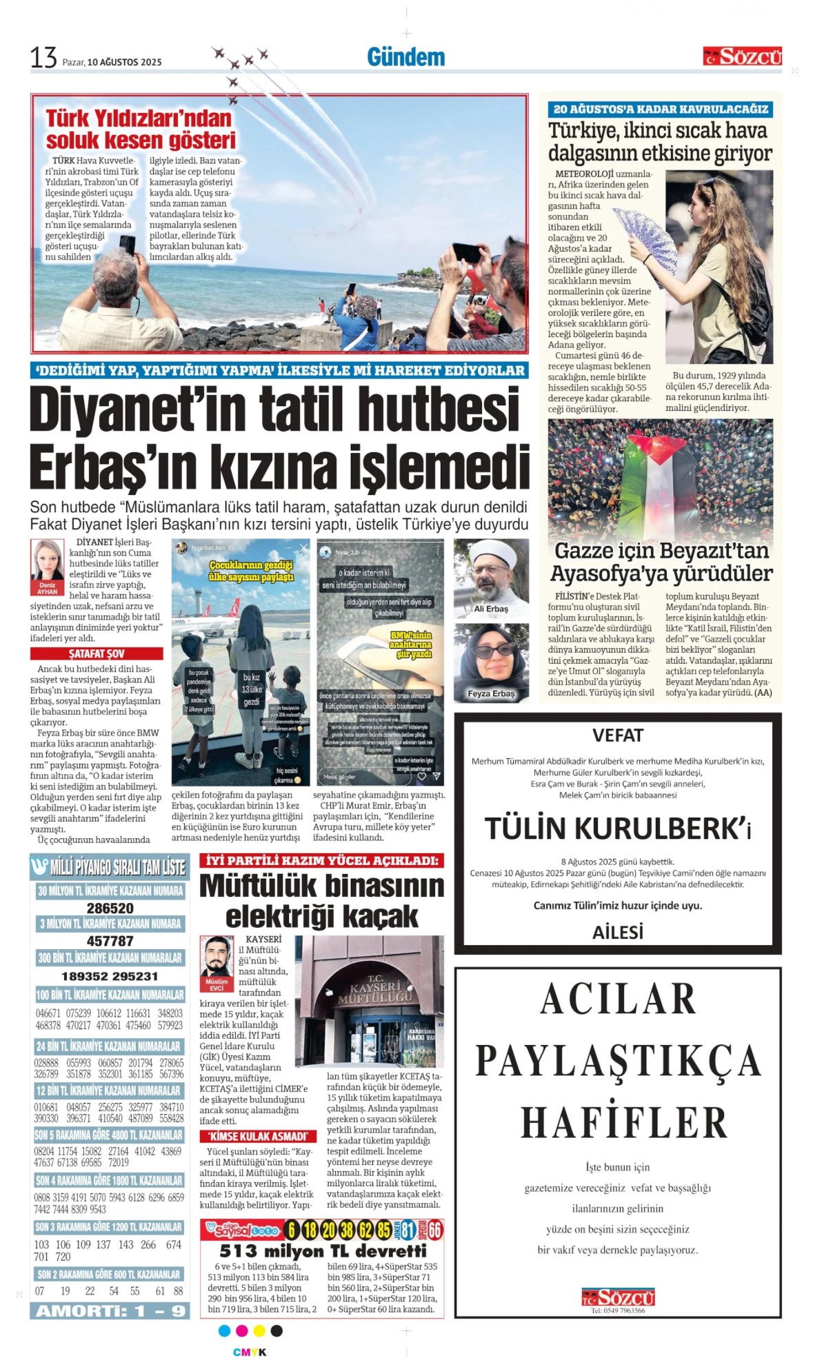 Sözcü Bugünkü Vefat İlanlar 10.8.2025;