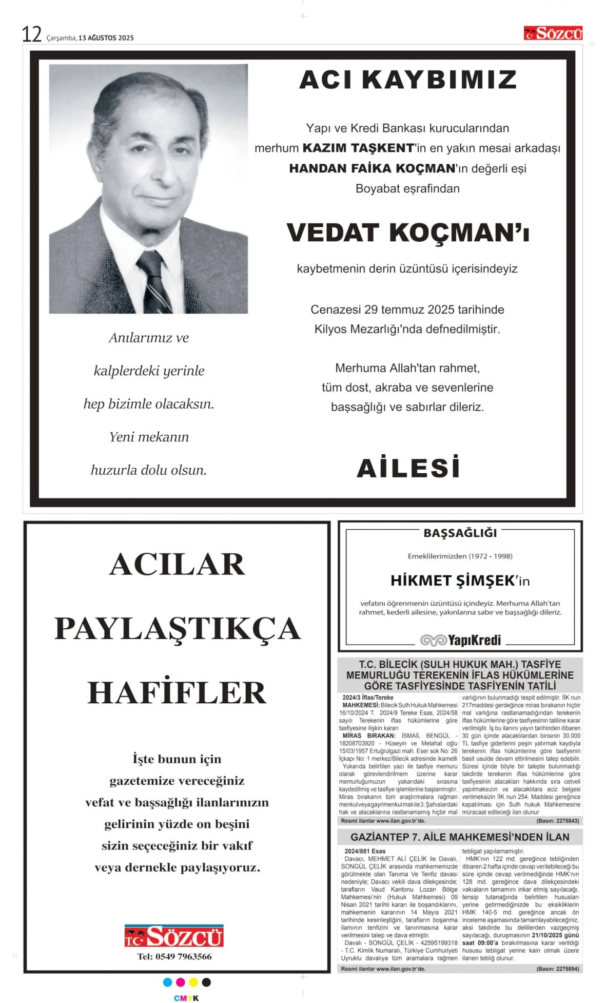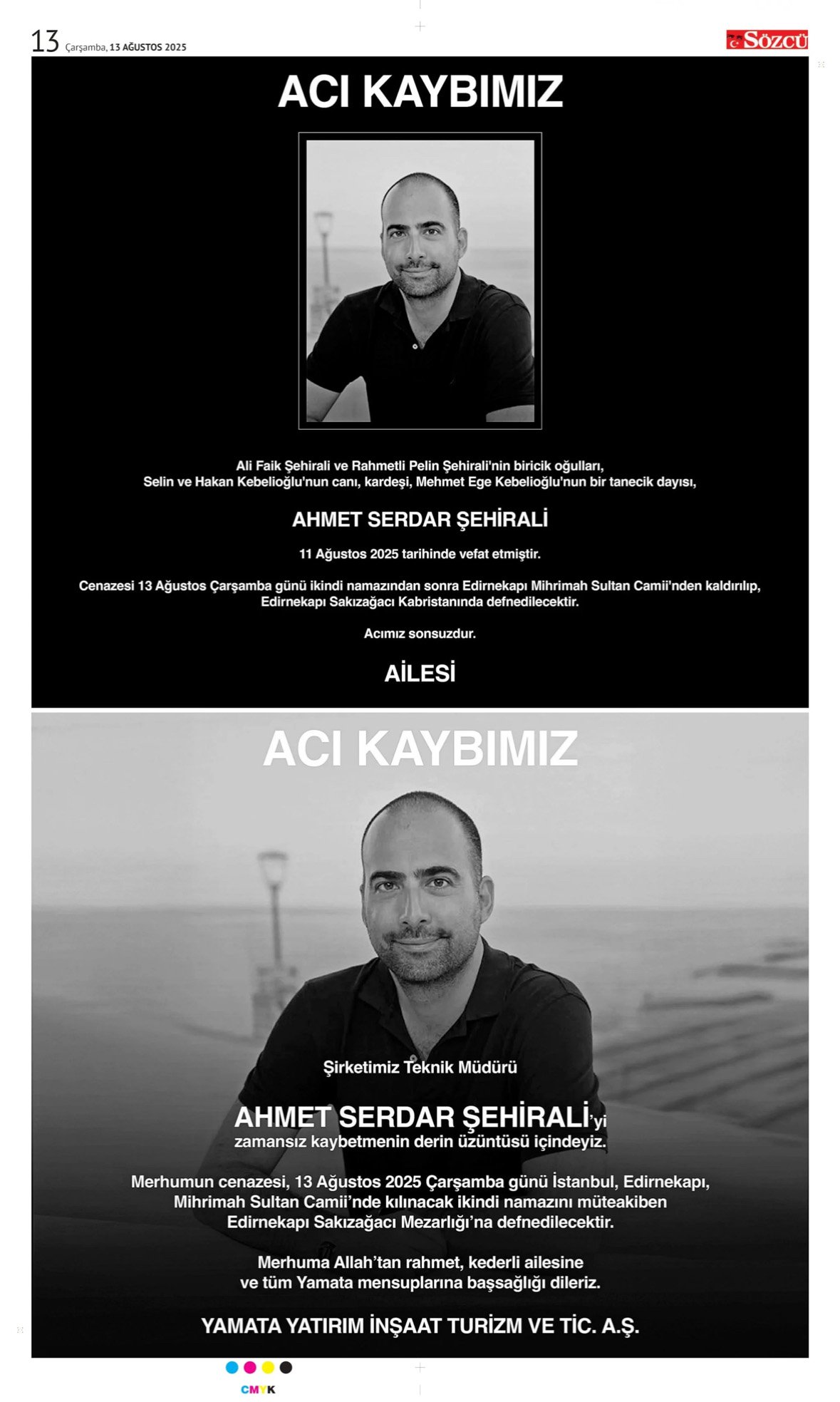 Sözcü Bugünkü Vefat İlanlar 13.8.2025;