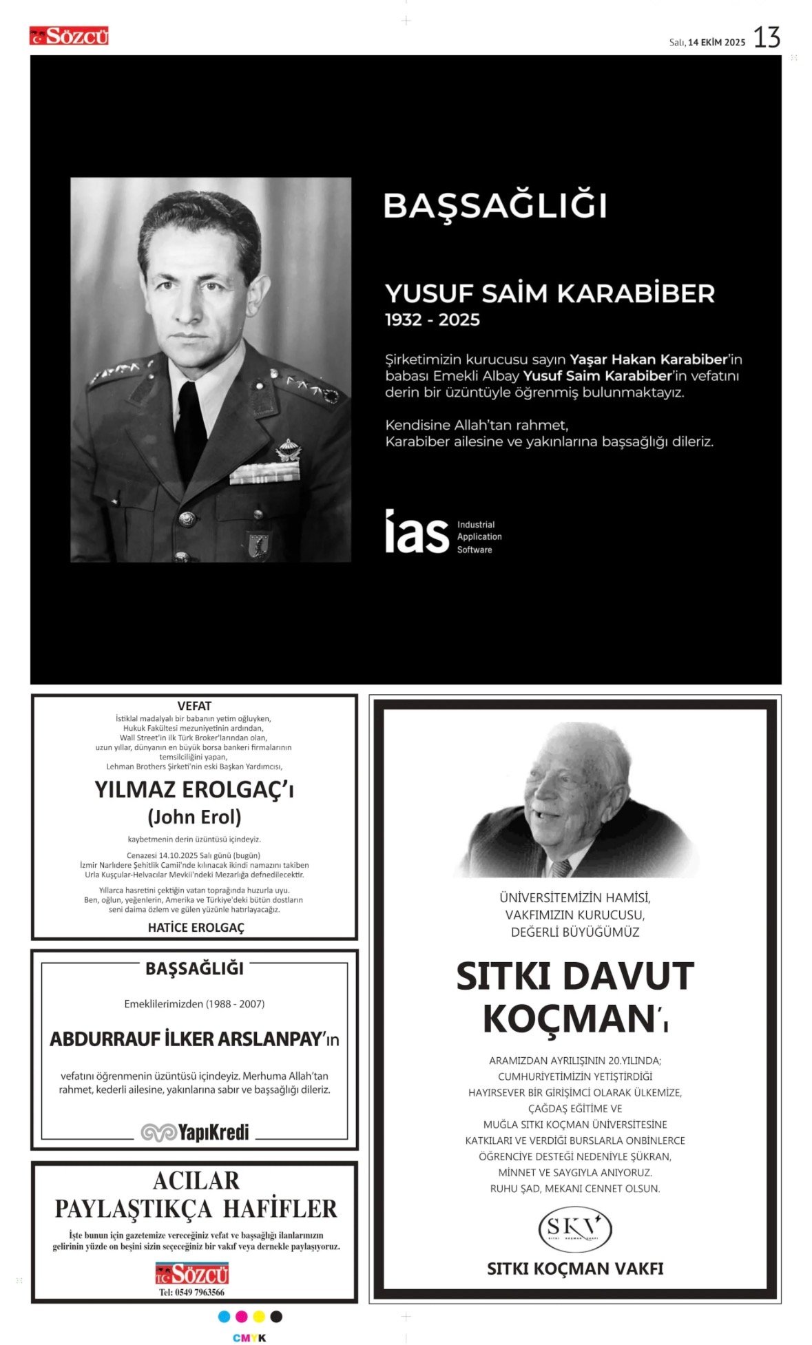 Sözcü Bugünkü Vefat, Başsağlığı, Anma İlanları 14.10.2025;