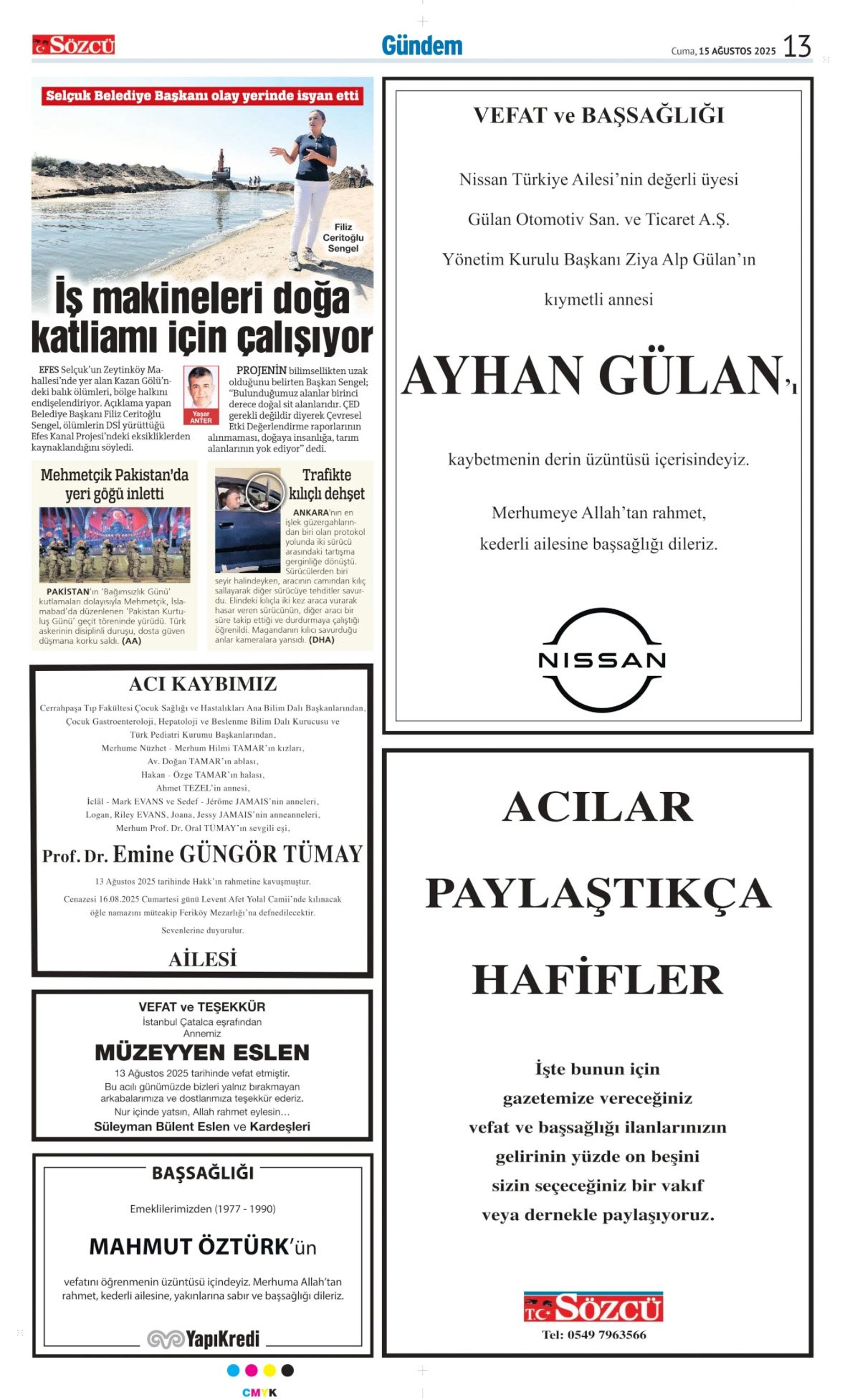 Sözcü Bugünkü Vefat İlanlar 15.8.2025;