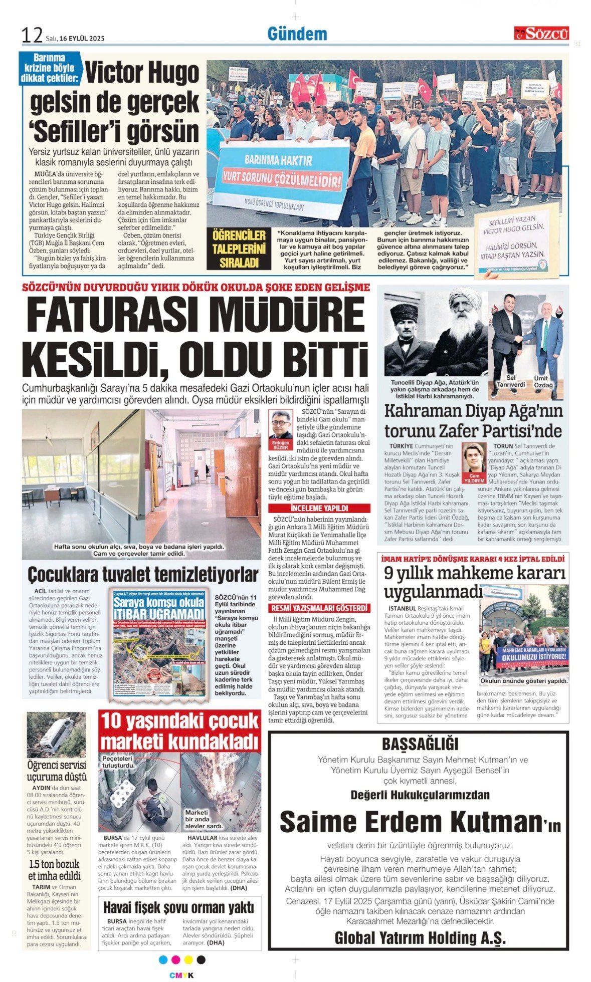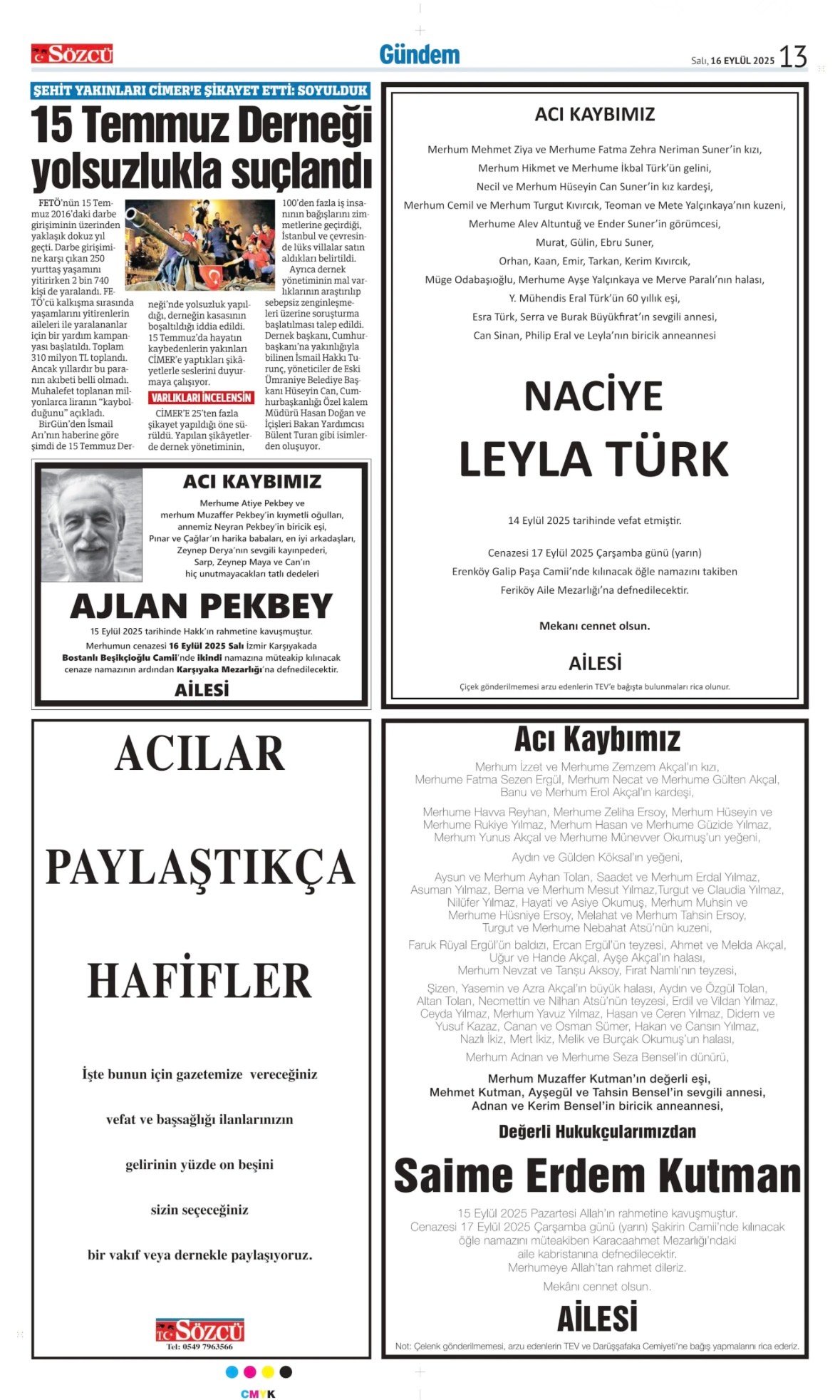 Sözcü Bugünkü Vefat İlanlar 16.9.2025;