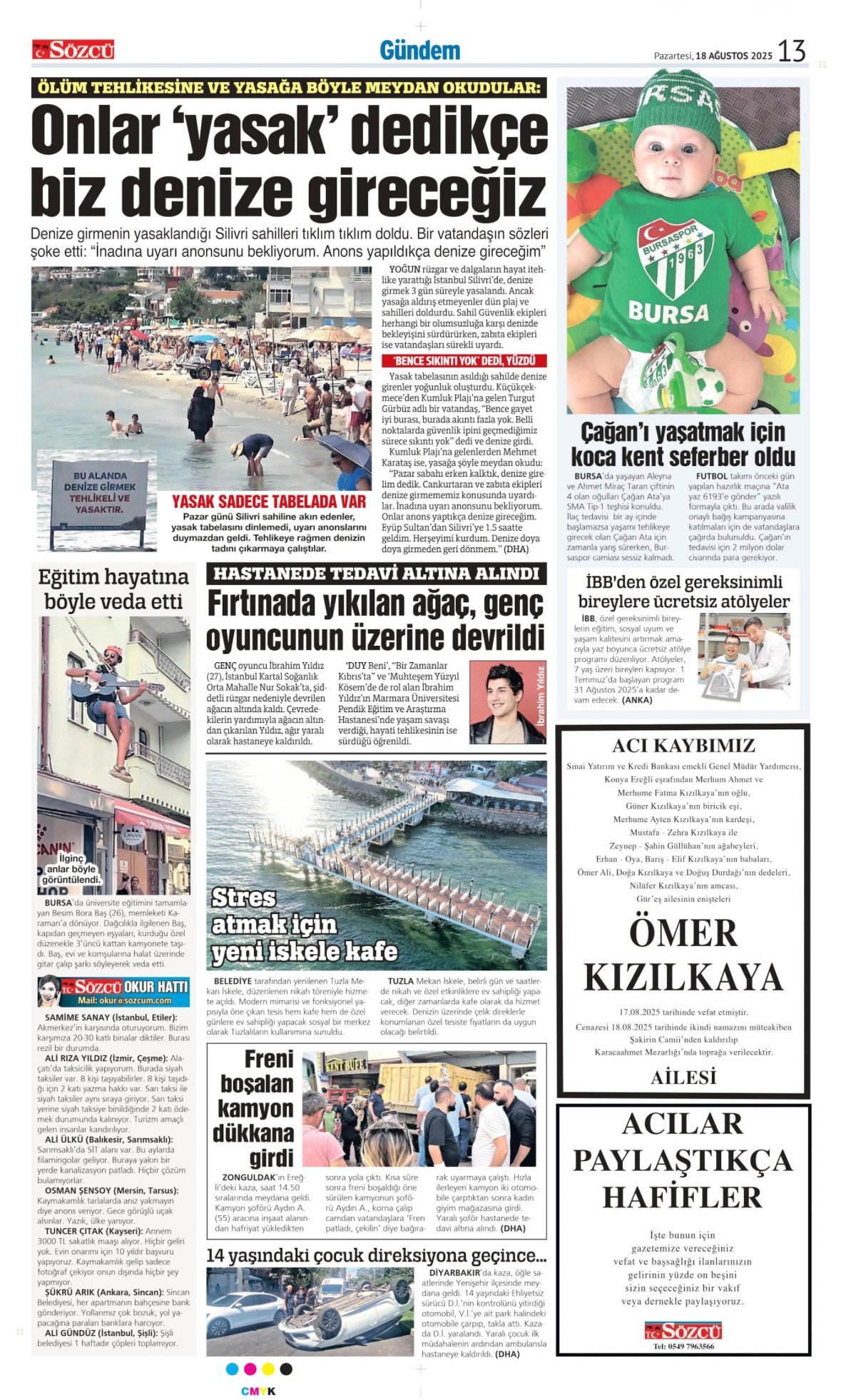 Sözcü Bugünkü Vefat İlanlar 18.8.2025;