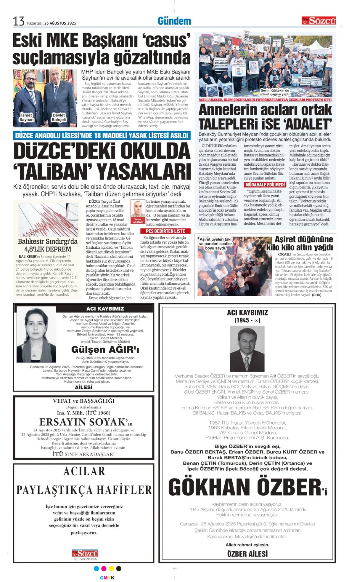 Sözcü Bugünkü Vefat İlanlar 25.8.2025;