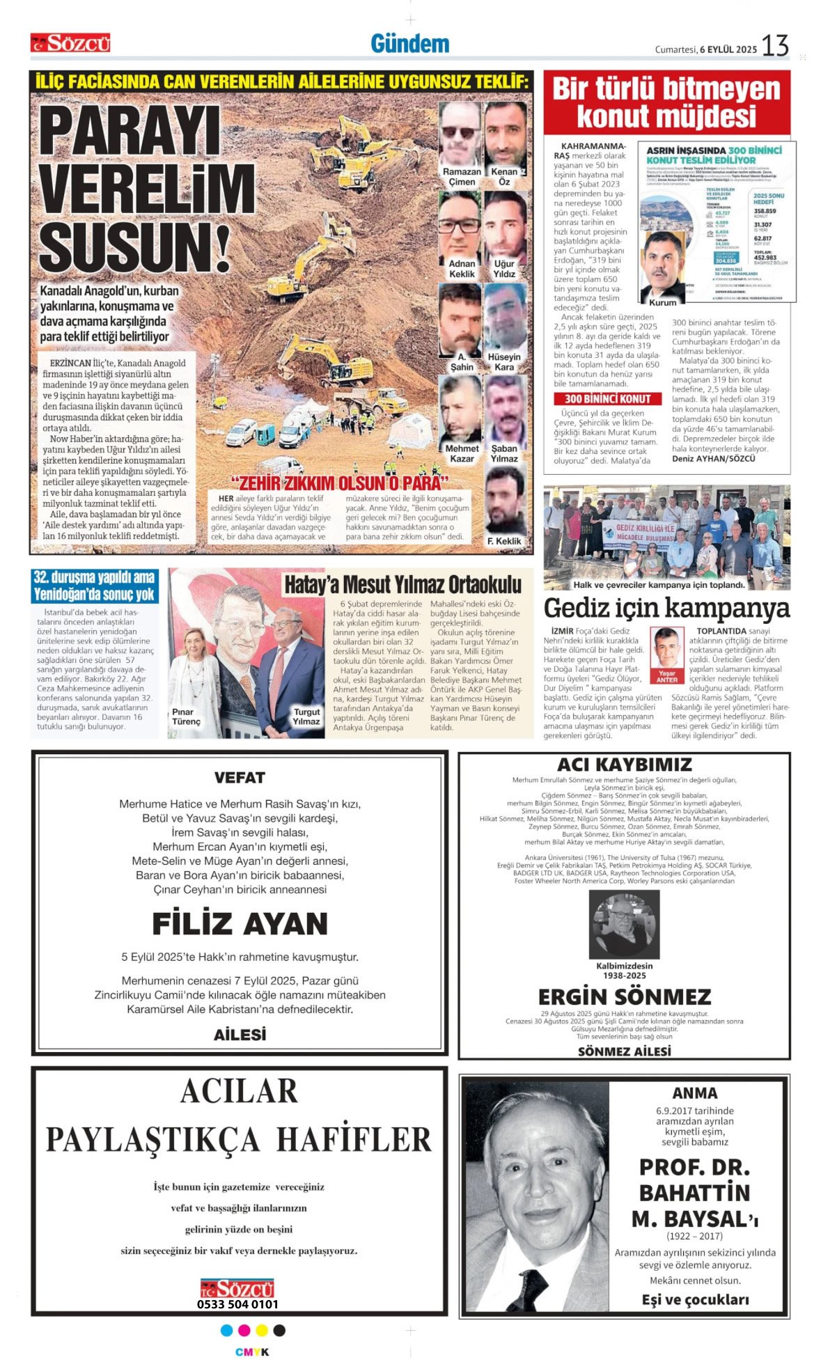 Sözcü Bugünkü Vefat İlanlar 6.9.2025;