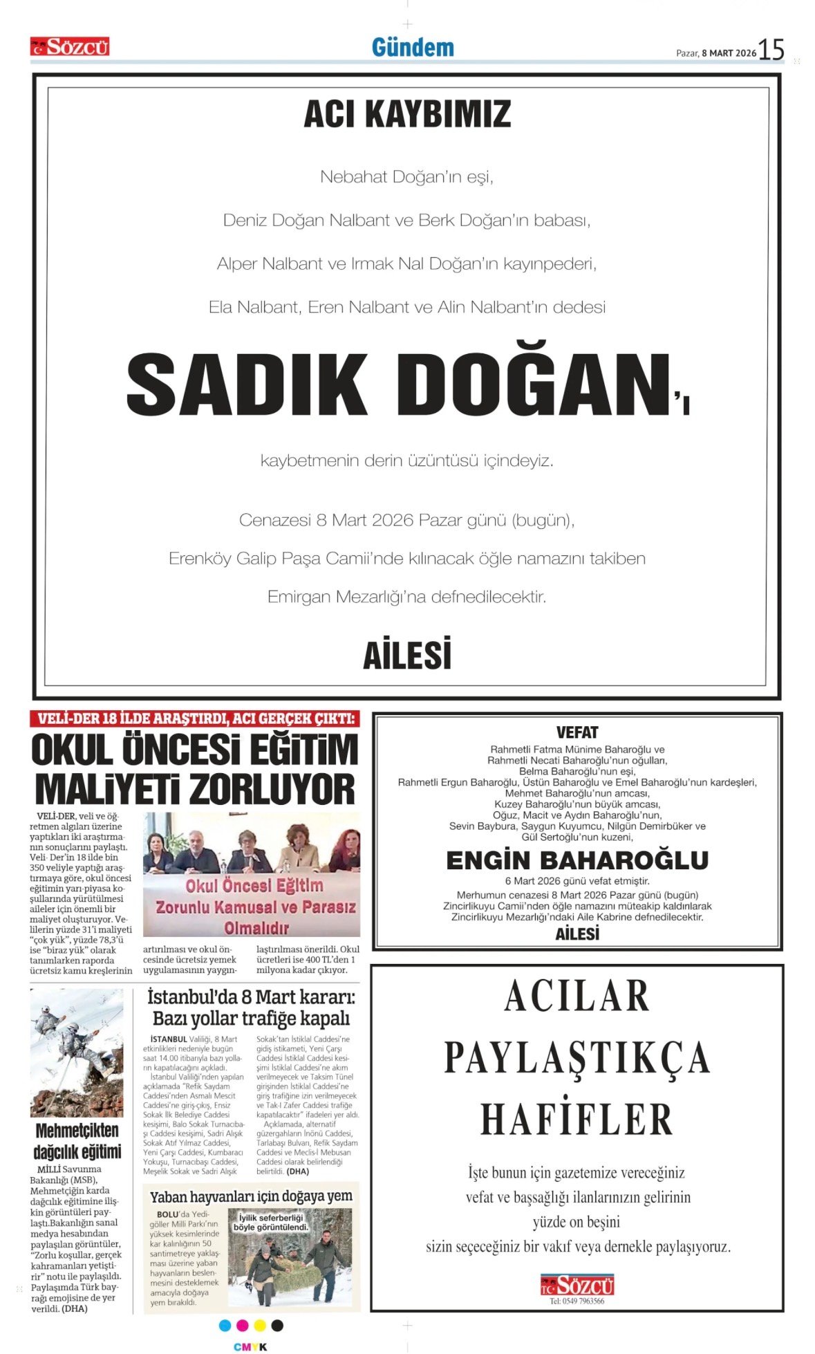 Sözcü Bugünkü Vefat İlan- Başsağlığı İlanı- Anma İlanları ve Arşiv Sayfalar. 8.3.2026