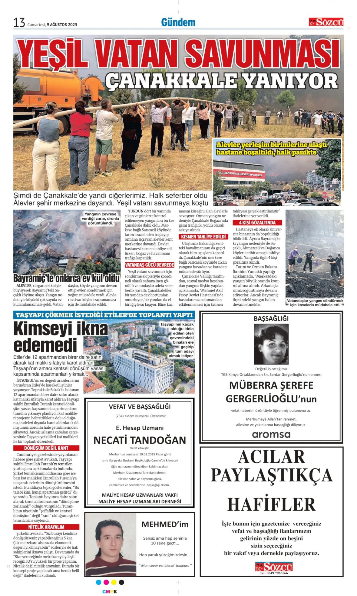 Sözcü Bugünkü Vefat İlanlar 9.8.2025;