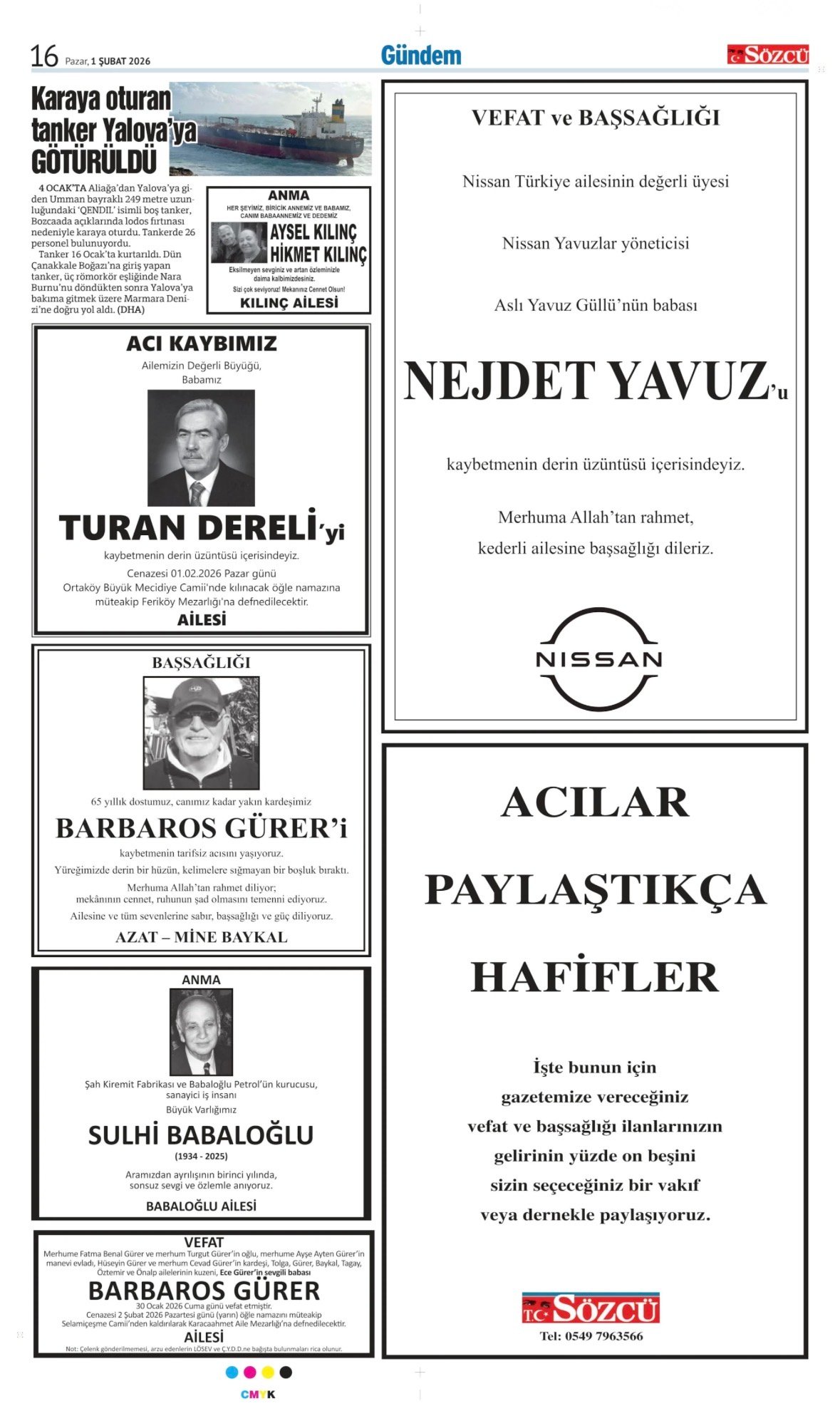Sözcü Bugünkü Vefat (Ölüm) – Başsağlığı – Anma – Teşekkür – Mevlit İlanları-1.2.2026