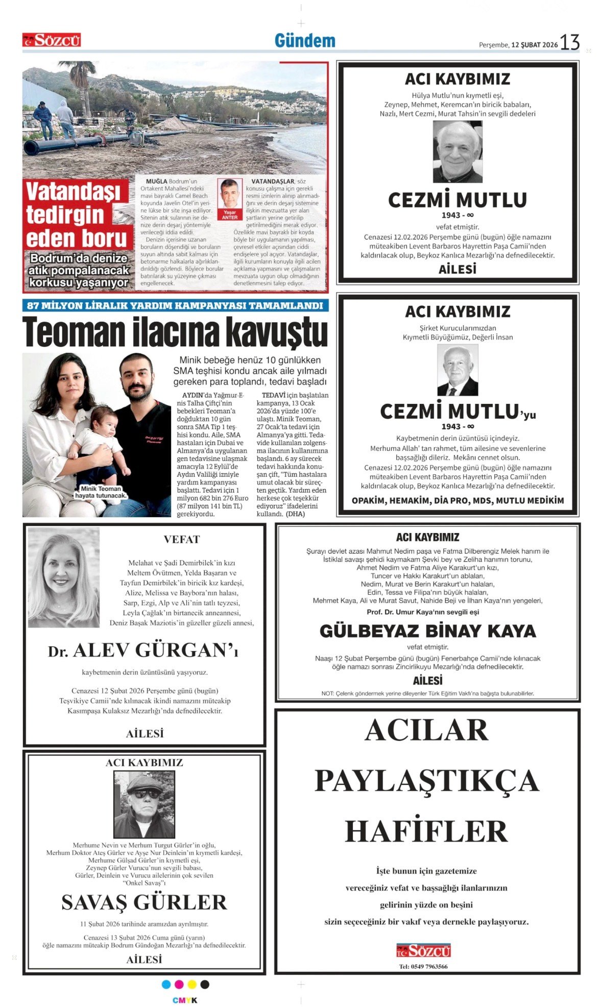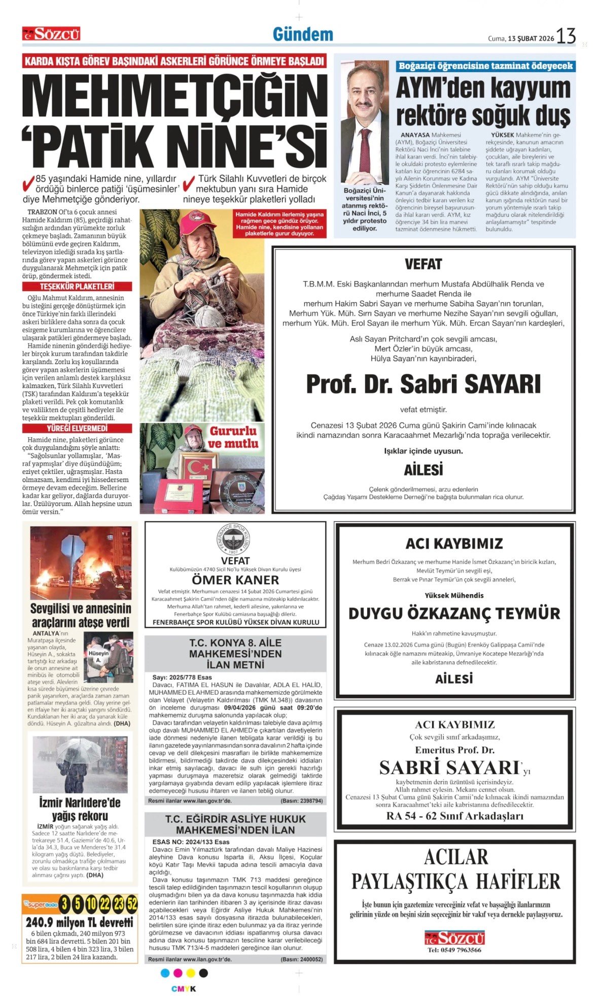 Sözcü Bugünkü Vefat (Ölüm) – Başsağlığı – Anma – Teşekkür – Mevlit İlanları-13.2.2026