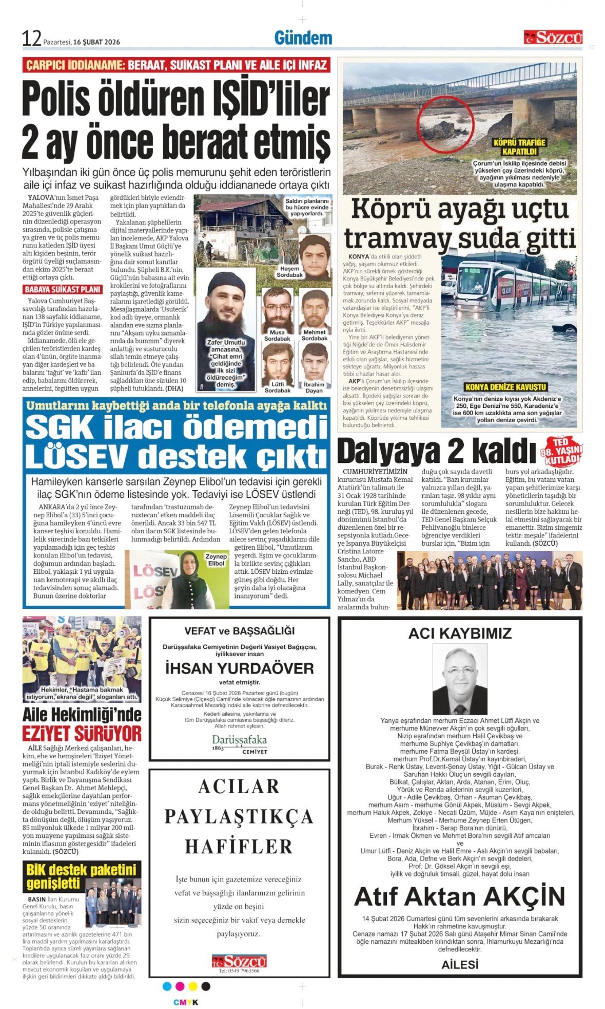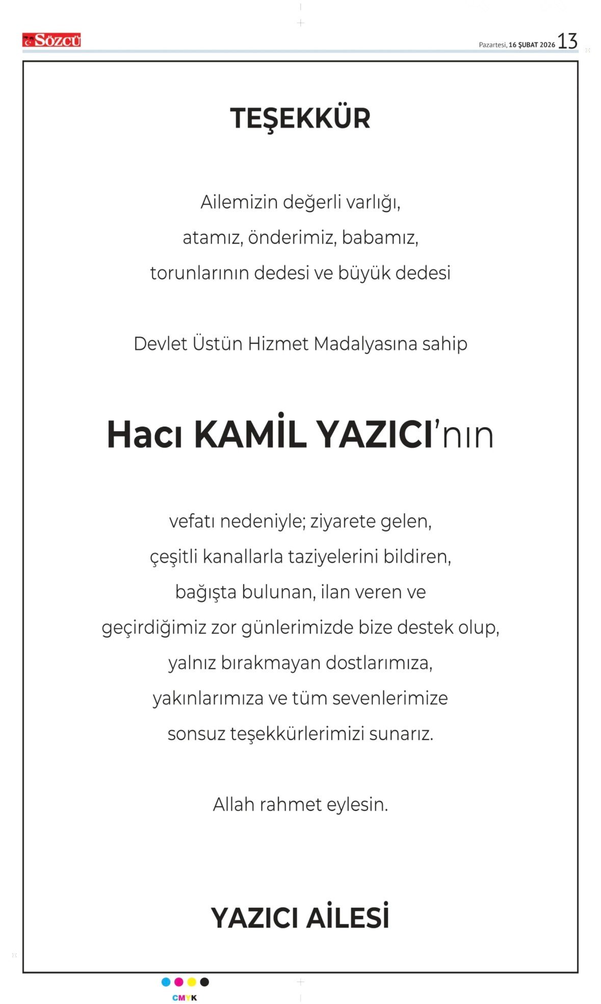 Sözcü Bugünkü Vefat (Ölüm) – Başsağlığı – Anma – Teşekkür – Mevlit İlanları-16.2.2026